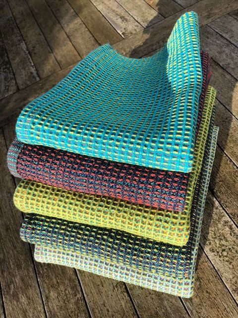 Unikat, gefertigt an Handwebstühlen in ihrem Atelier „Silberfaden“. Bunte, karierte Decken